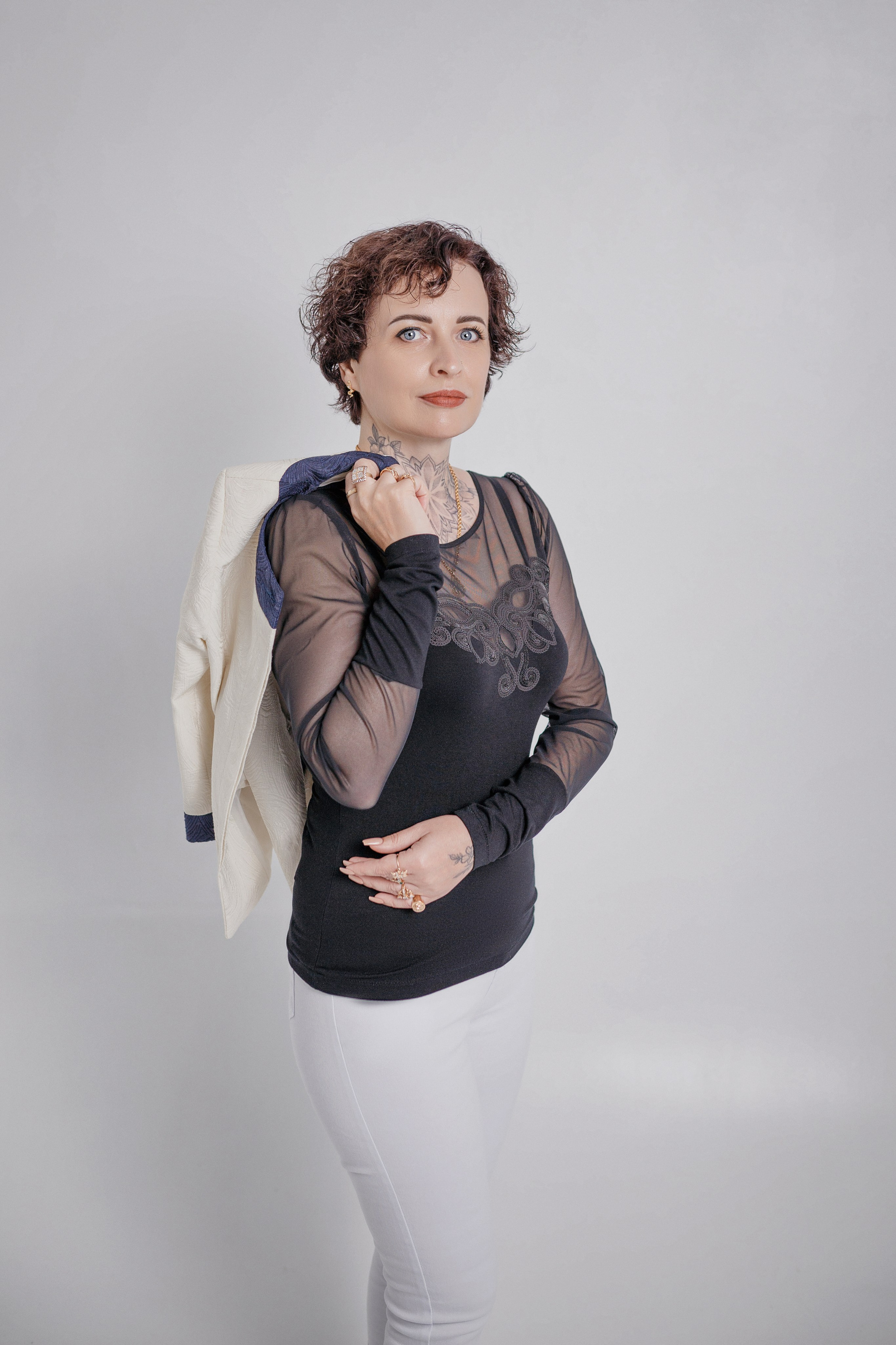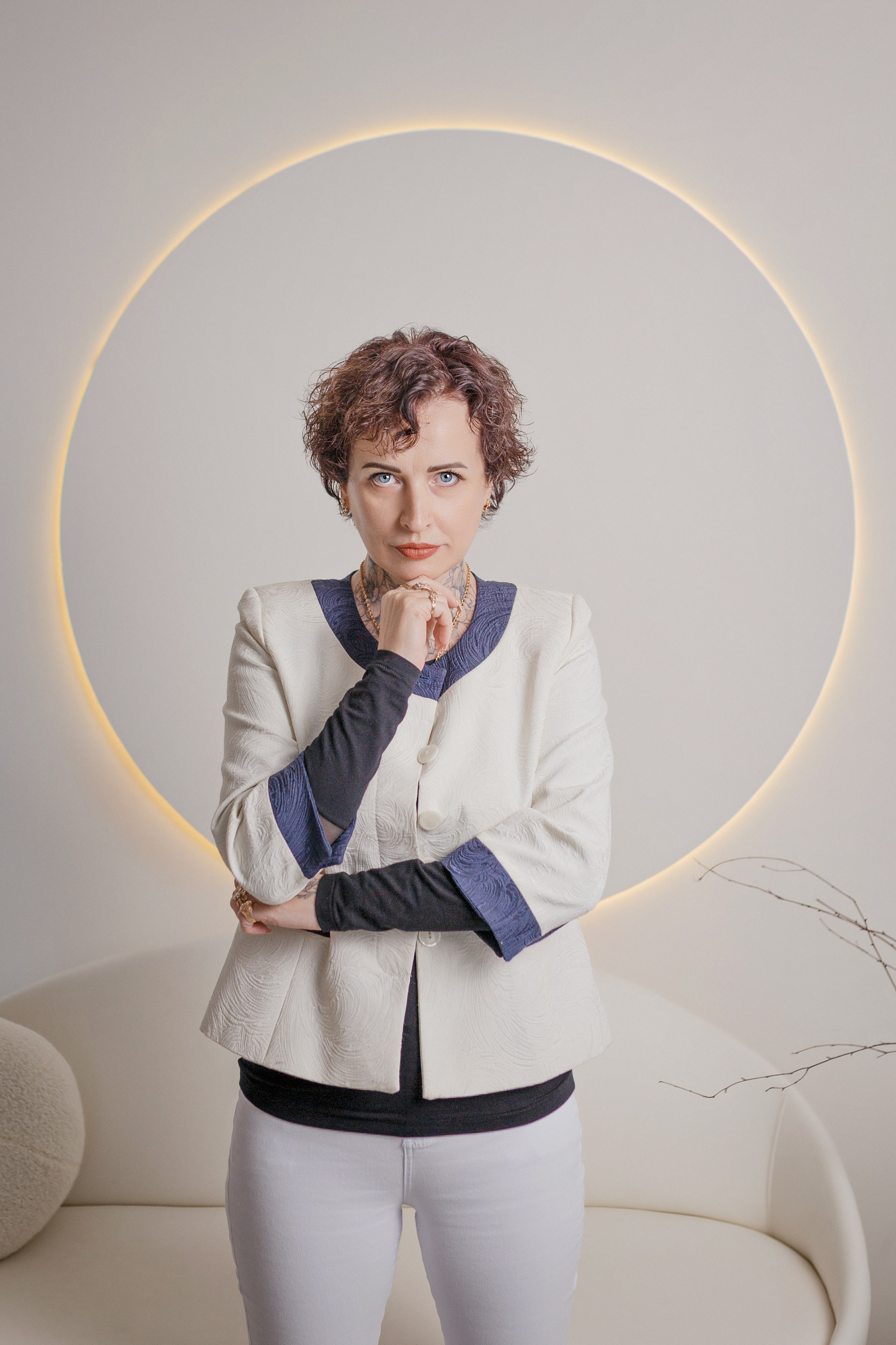 · Образ в жакете — про её экспертность и лидерство. Это не сухая деловитость, а собранная, направленная сила. Энергия, которую она теперь вкладывает в свой бизнес и учеников.